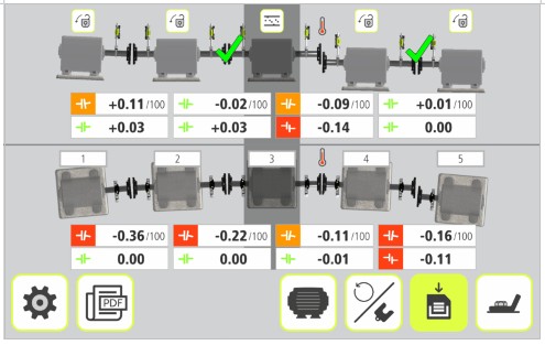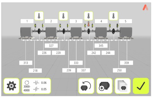 Os usuários podem bloquear qualquer máquina para compensar restrições de parafusos ou bases, definir valores-alvo e visualizar o progresso do alinhamento em tempo real. O resultado é um processo de alinhamento mais rápido e intuitivo, que melhora a precisão e reduz o estresse em trabalhos complexos com várias máquinas.